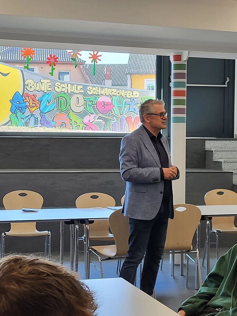 Am Montag, dem 28.04.2025, besuchte Herr Martin Scharf die 7., 8. und 9. Klasse der Mittelschule Schwarzenfeld und berichtete den Schülern vieles von seiner Arbeit als Mitglied des bayerischen Landtags.