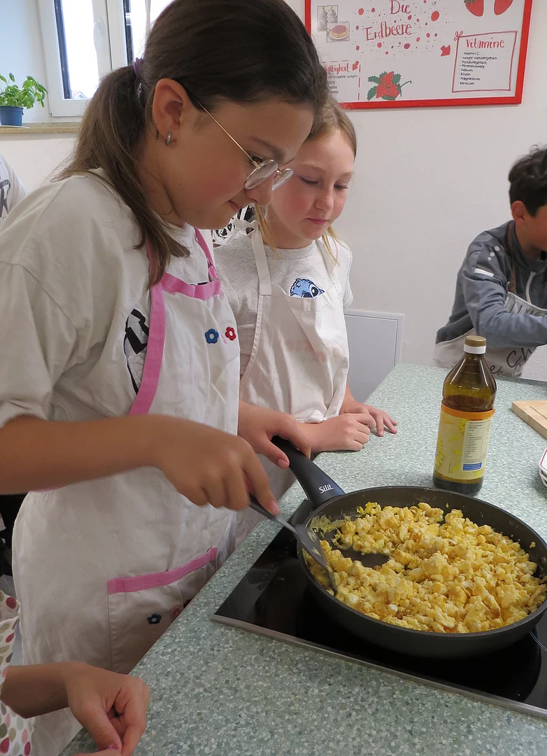 Erlebnisbäuerin Daniela Schönberger besuchte unsere Schule an drei Vormittagen, um den Kindern den „Weg vom Huhn zum Ei“ anschaulich und praxisnah zu vermitteln. Im Mittelpunkt stand dabei die gemeinsame Zubereitung eines Rühreies, das mit frischem Schnittlauch und Butterbrot nicht nur genussvoll verzehrt wurde, sondern auch Anlass bot, wichtige Hygiene- und Verhaltensregeln in der Küche kennenzulernen – ganz im Sinne einer gesunden und nachhaltigen Ernährung.