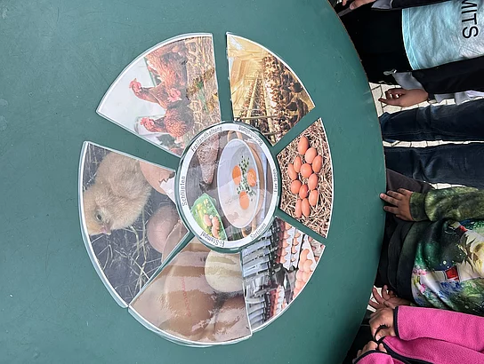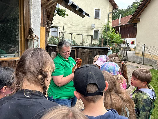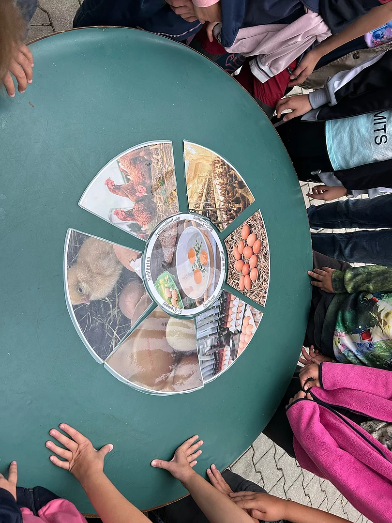 Ergänzend dazu durften die Klassen den Bauernhof der Familie Schönberger „Beim Schmied“ in Brudersdorf besuchen. Hier wurde das Thema „Vom Huhn zum Ei“ lebendig: Die Kinder erlebten den Alltag auf einem Bauernhof hautnah, durften selbst Hand anlegen und gewannen spannende Einblicke – etwa beim Entnehmen frischer Hühnereier, das für viele ein besonderes Erlebnis war.