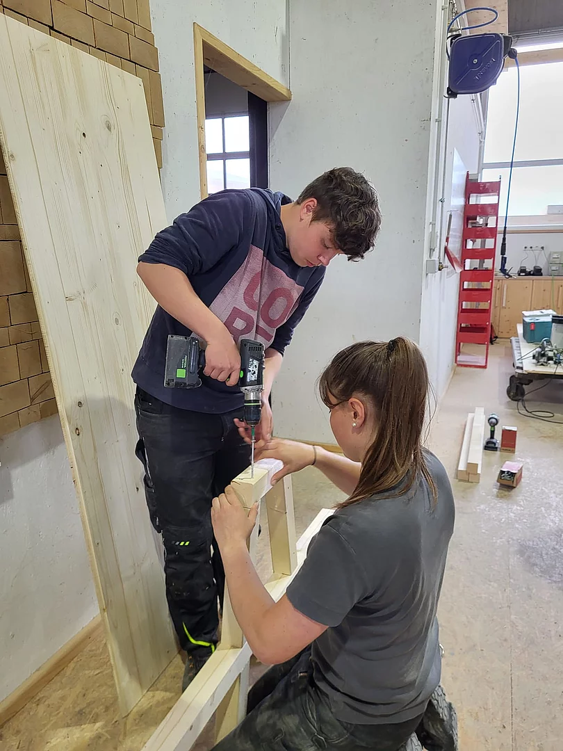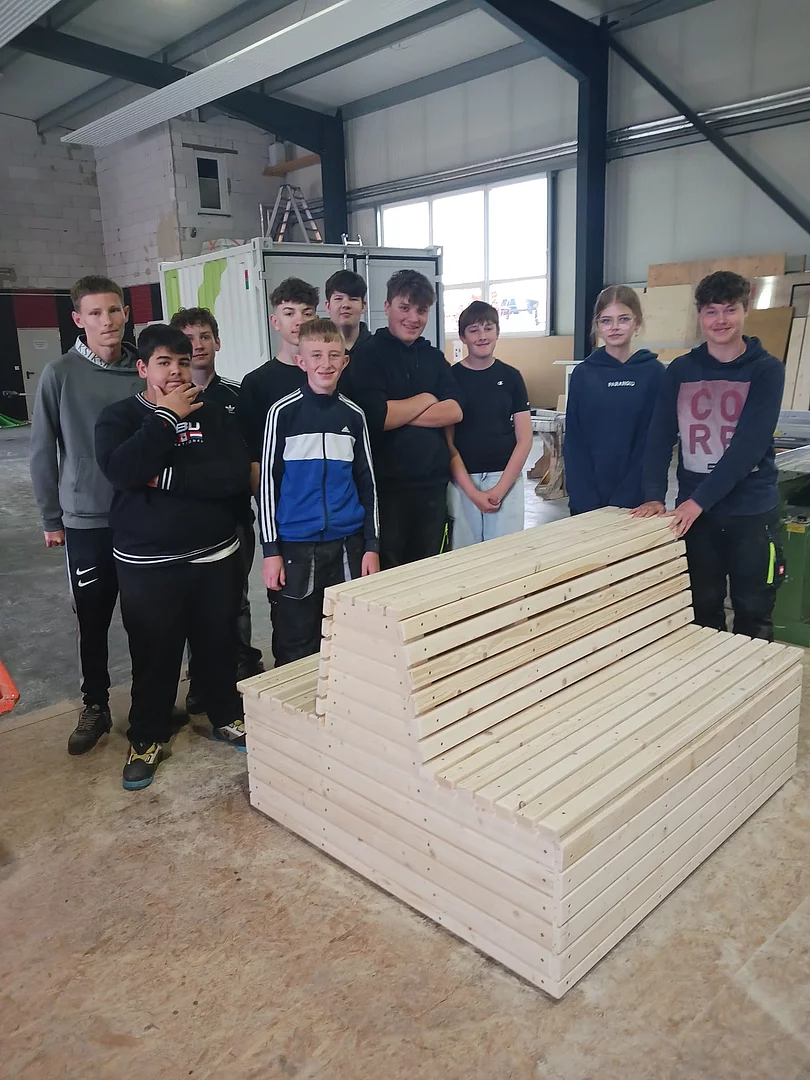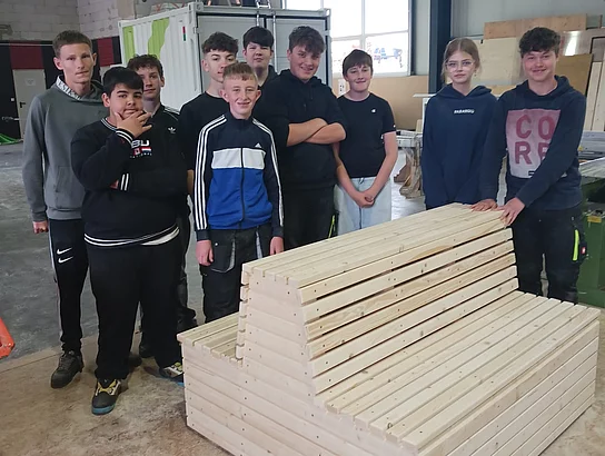 Zusammen mit einer Auszubildenden und dem Geschäftsleiter Richard Kurz wurde eine Sitzbank für die Schule gebaut.