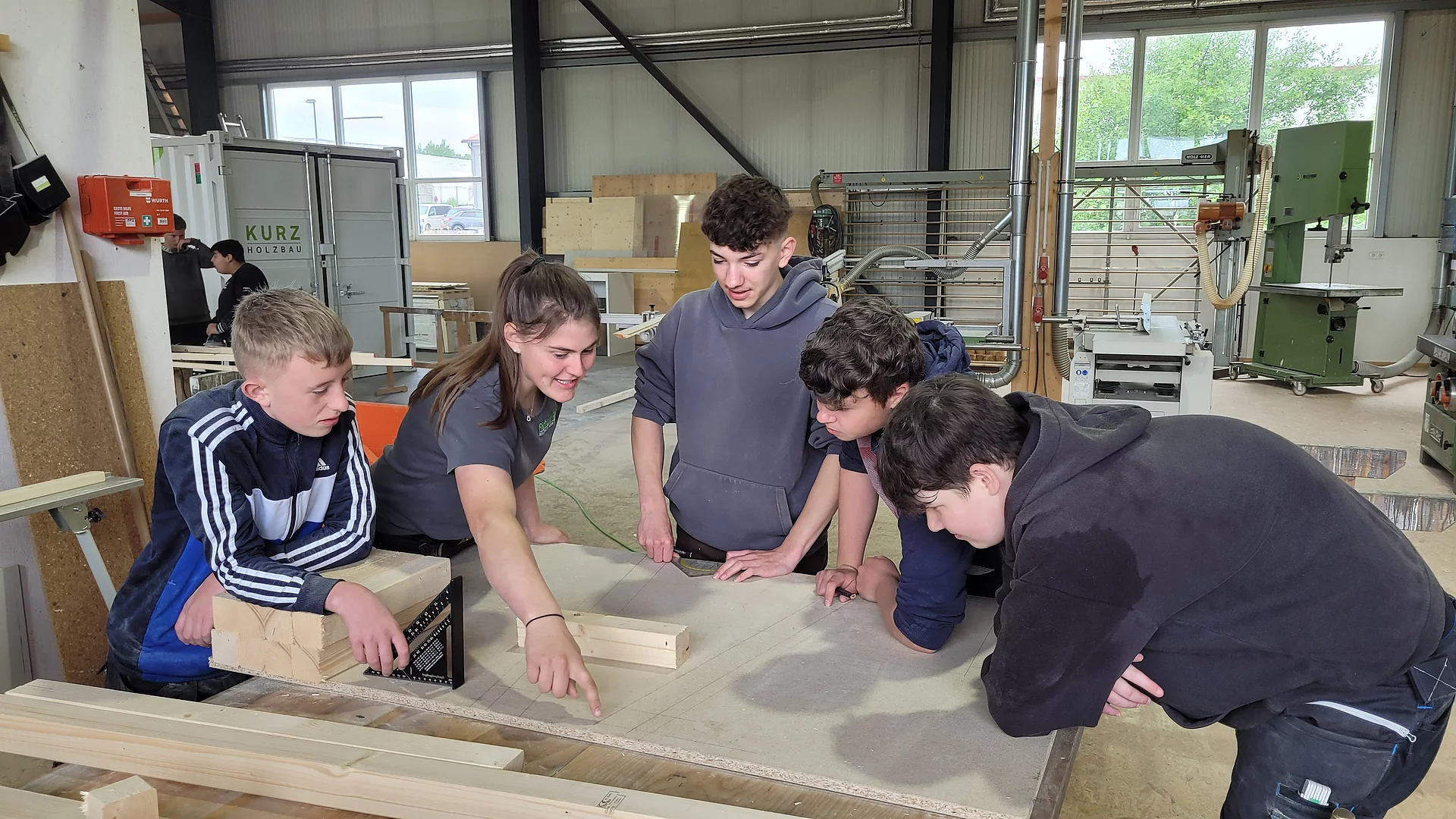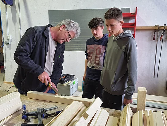 Im Rahmen eines „Praxis an Mittelschulen-Projekts“ besichtigte die Technik-Gruppe der 7. Klasse bereits im April den Betrieb Holzbau Kurz. Jetzt folgte der Praxistag für die 8. Klasse im Unternehmen.