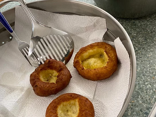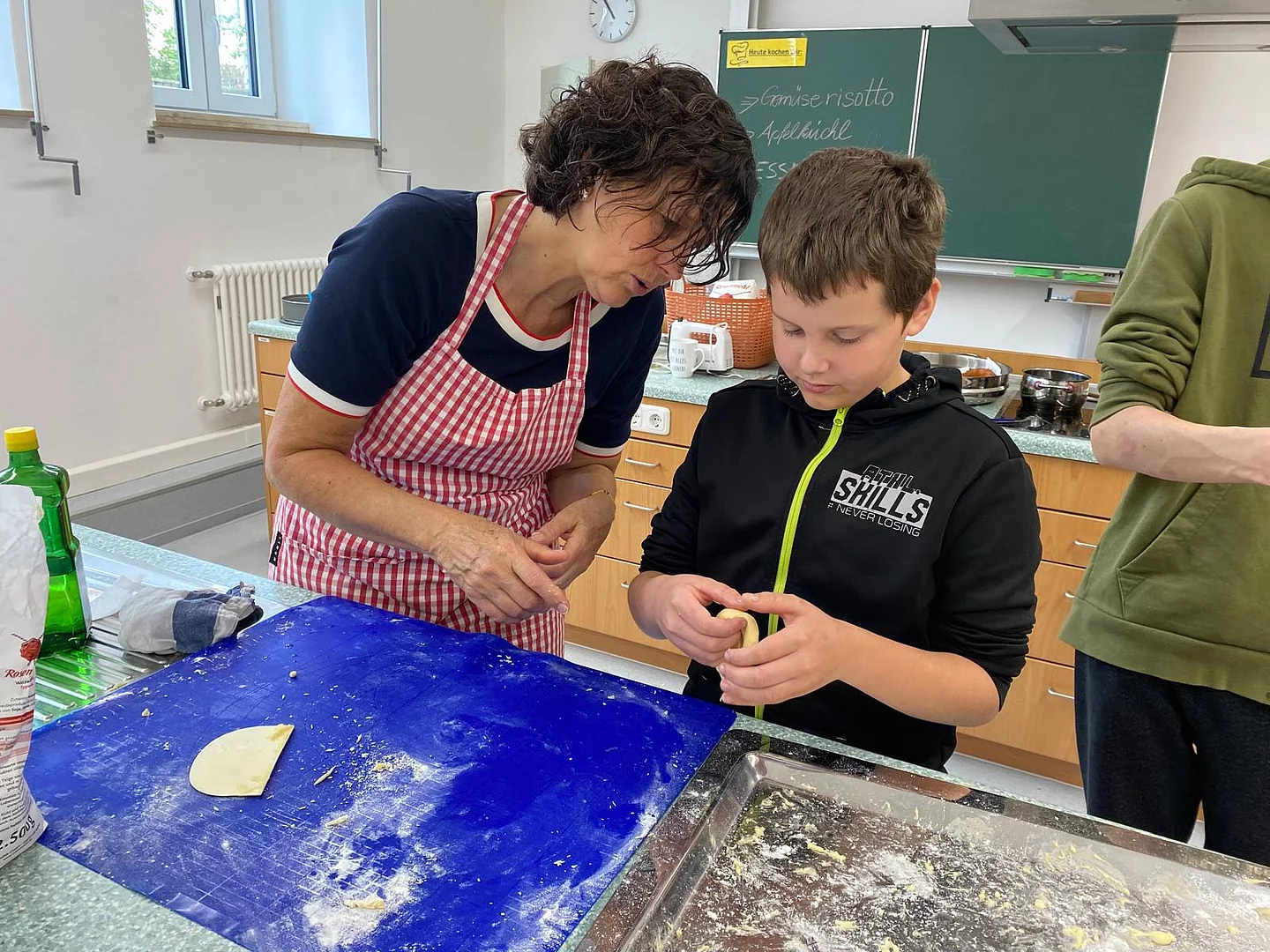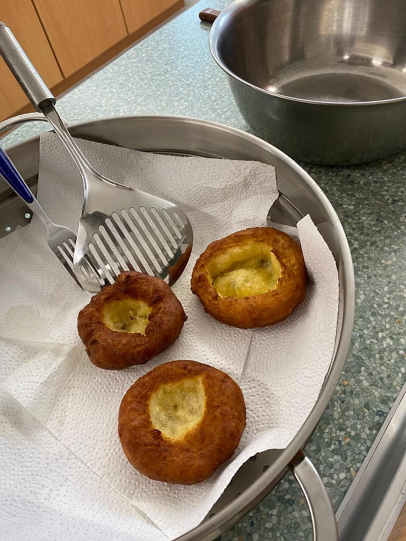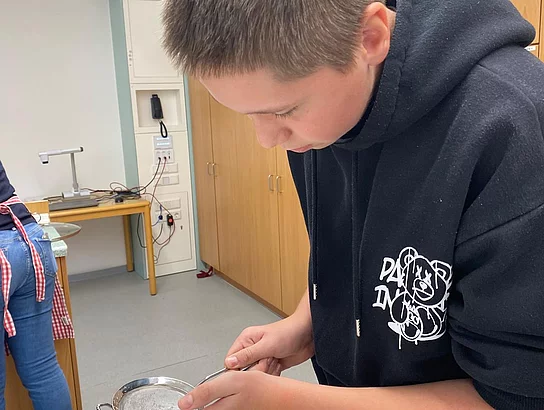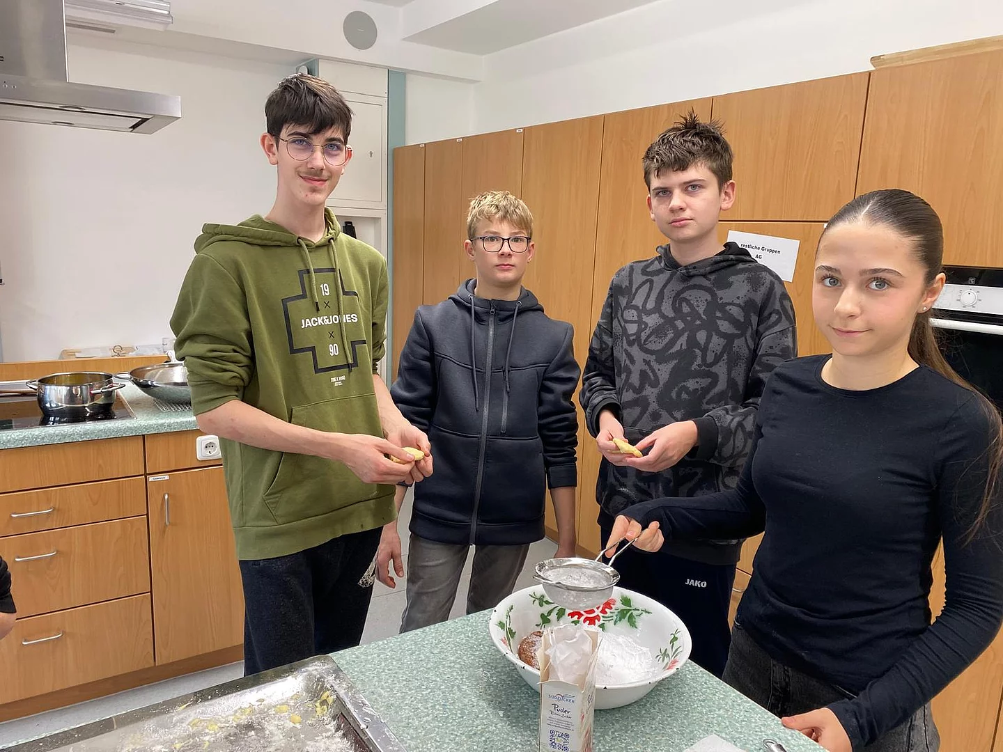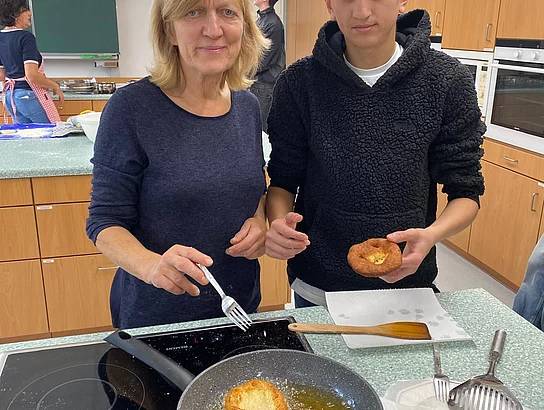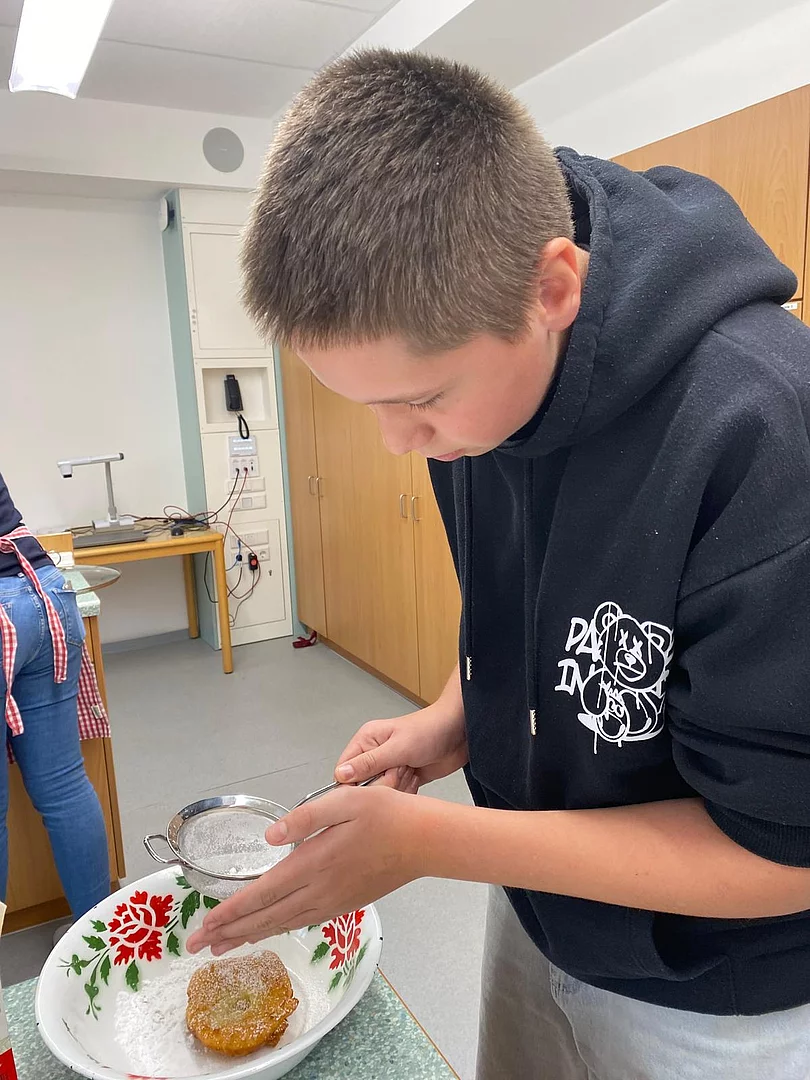Schnell stellten die Schüler der Klassen 8 und 9 fest, dass „Kiachldrahn“ und „Ausbacka“ wie so manches eine Wissenschaft für sich ist und gelernt sein will. Dem stellten sie sich und „drahten“ in der Schulküche unter der Anleitung ihrer Lehrerin Frau Ruhland und den Kiachlbackerinnen Frau Hösl und Frau Schuster ihre ersten „Keichln“, um sie dann selbst im heißen Fett auszubacken und mit Puderzucker zu bestreuen. Wenn manche Kiachln auch nicht ganz so aussahen wie die von der Oma – sie schmeckten hervorragend und jeder „glangte“ gerne zu!